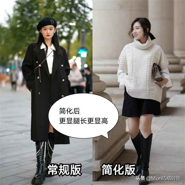 穿长靴时用宽窄结合法则,搭配露腿下装,小个子也能穿出大长腿。整体颜色要简洁,避免花哨,把视觉焦点上移,自然显高。