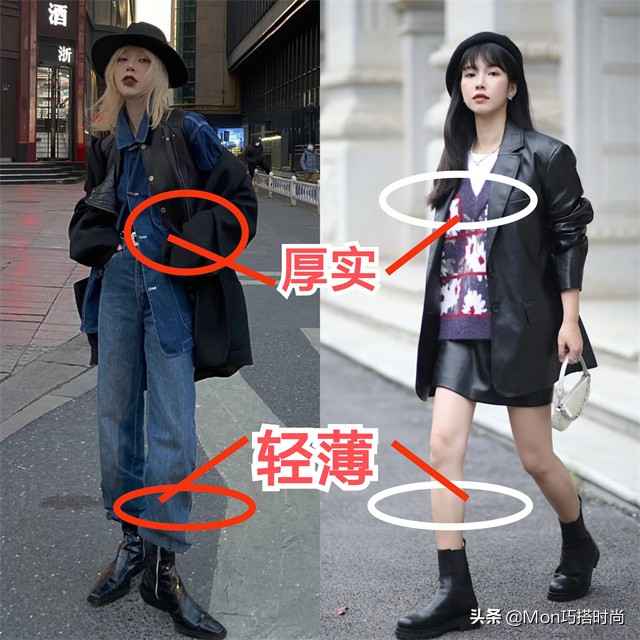 上厚下薄就是上半身穿厚重单品,下半身选轻盈款式。这样既保暖又不臃肿。比如用大衣叠穿牛仔衣或西装配针织衫,下半身搭轻便短靴或牛仔靴,时髦又暖和。