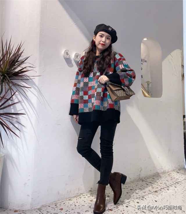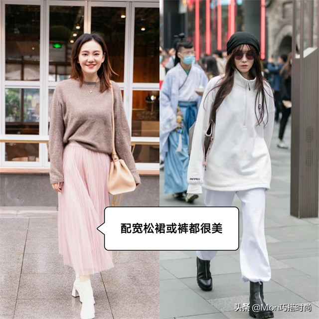 秋冬保暖要护住脖子、手腕、腰、膝盖和脚踝这些关键部位。穿宽松毛衣遮住关节,配上小脚裤和裸靴,上宽下窄,暖和又不显胖。