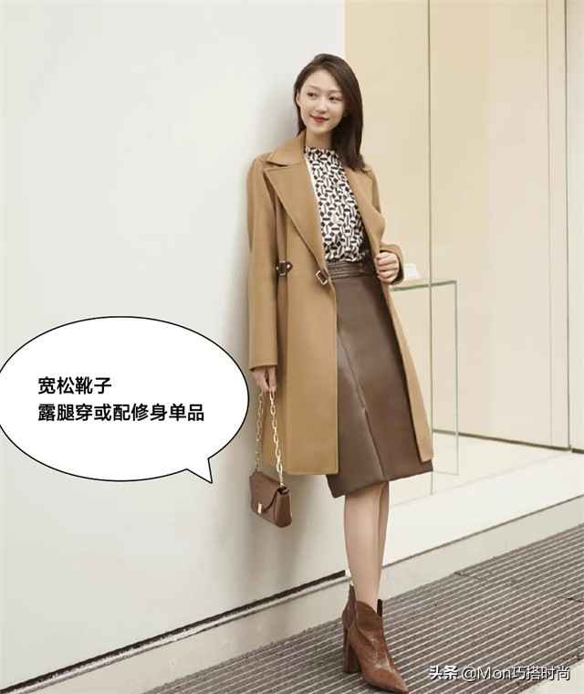 宽松靴子直接露腿穿,或配修身半裙、直筒裤、烟管裤、小脚裤,整体更干练。比如宽松短靴露一截小腿,搭包臀裙,气场全开!