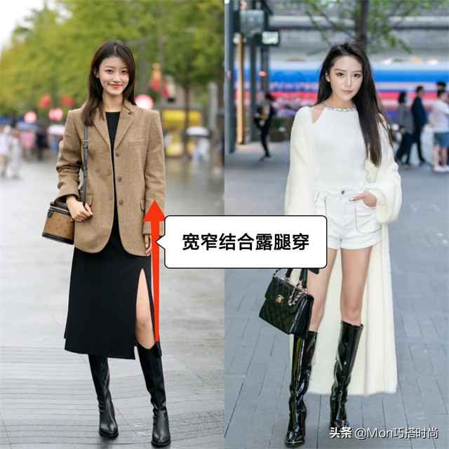 微宽松的膝下靴是秋冬凹造型利器,搭对了显高又显瘦。腿短腿粗的姐妹别选设计复杂的款式,右边这种纯色简约、靴口倒V型的才最显腿长。