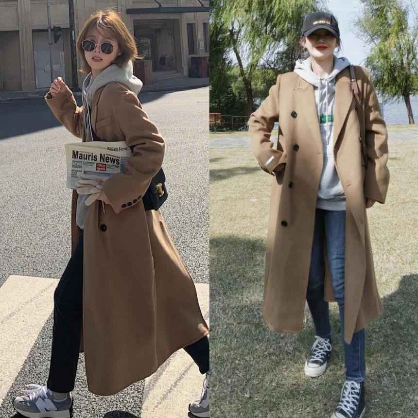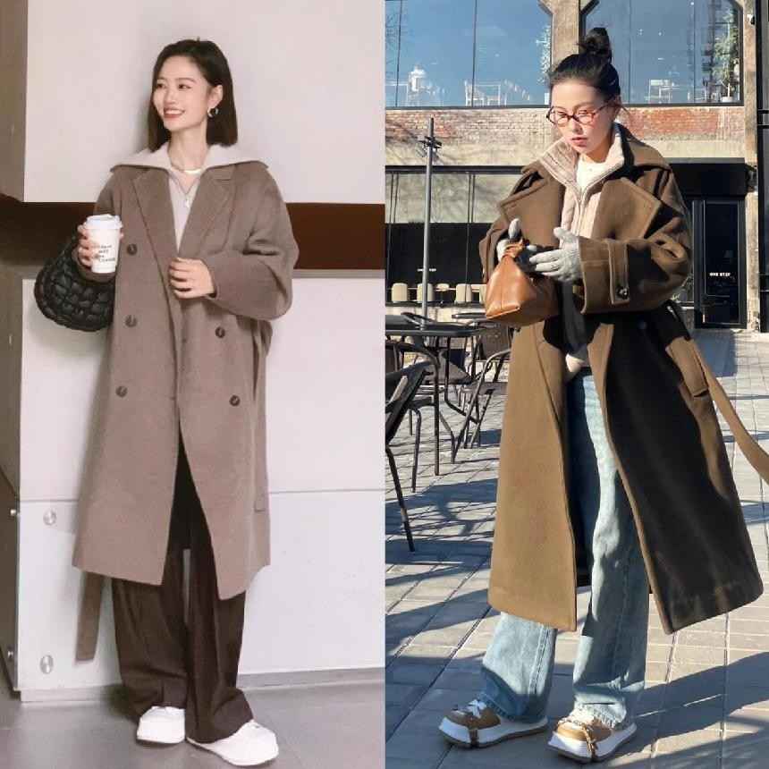 深驼色羊毛大衣内搭浅灰色加绒卫衣,下身配直筒裤和帆布鞋,上班得体下班休闲,一衣多穿超实用。