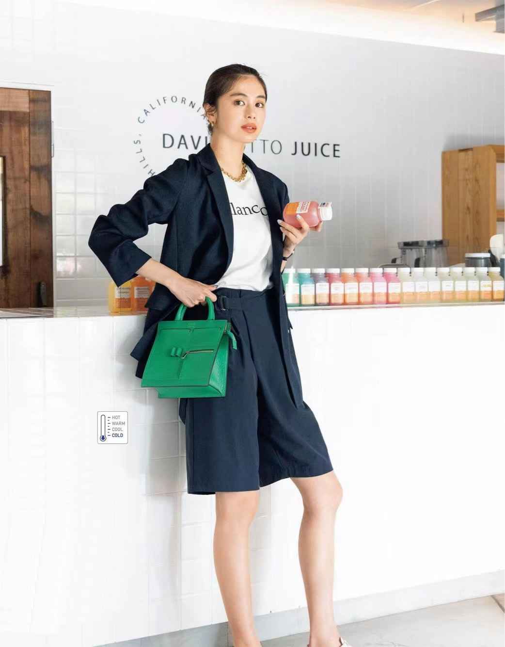 中裤的职场造型来啦!搭配深蓝西装,直接穿去办公室。内搭白T恤增加休闲感,信手拈来。