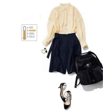 米黄色衬衫配黑中裤,透视面料清凉,中裤干练,完美应对暑热。配色一柔一稳,雅致大方。