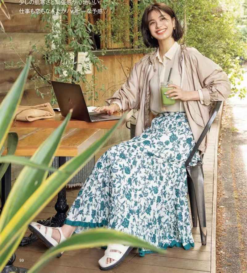 比如青春小碎花,减龄又浪漫。白底蓝花半裙配米色衬衫和防晒衣,应对夏日寒暑变化。