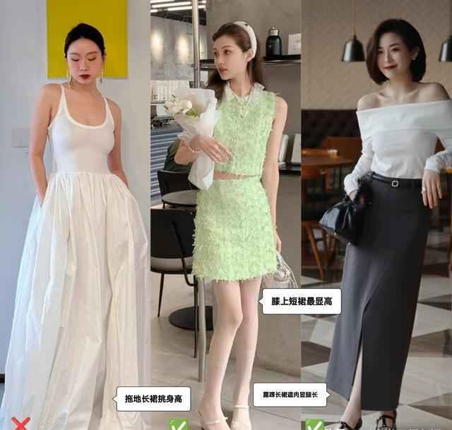 膝盖位置的裙子会把身材切成五五分,瞬间显腿短。无论高矮,这个长度都是雷区,千万别碰。