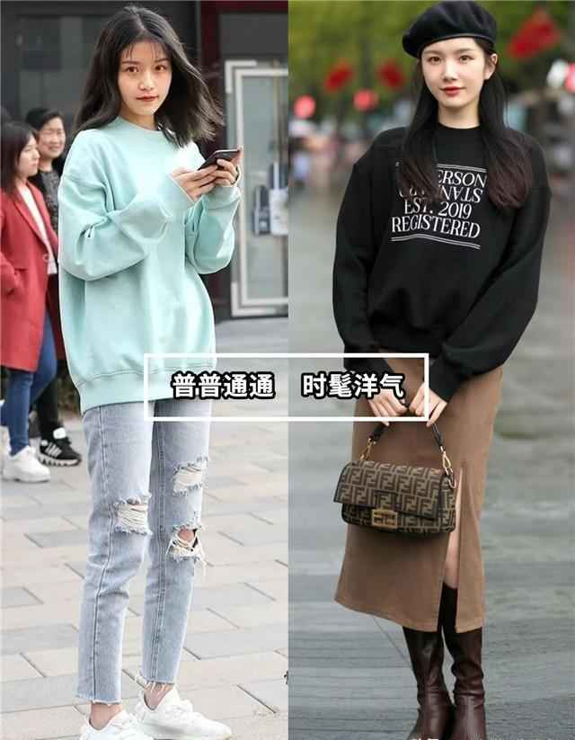 【对比②:同样是圆领卫衣搭配不同的下装,半身裙完胜长裤】