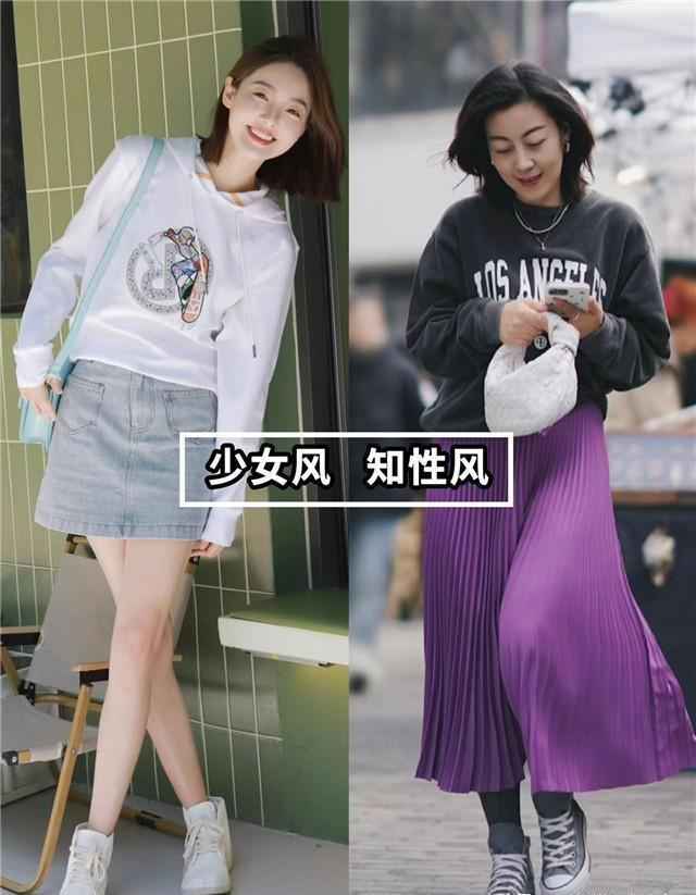 卫衣配半身裙,年轻女生穿出少女感,30+女性显知性风,反差搭配很吸睛。
