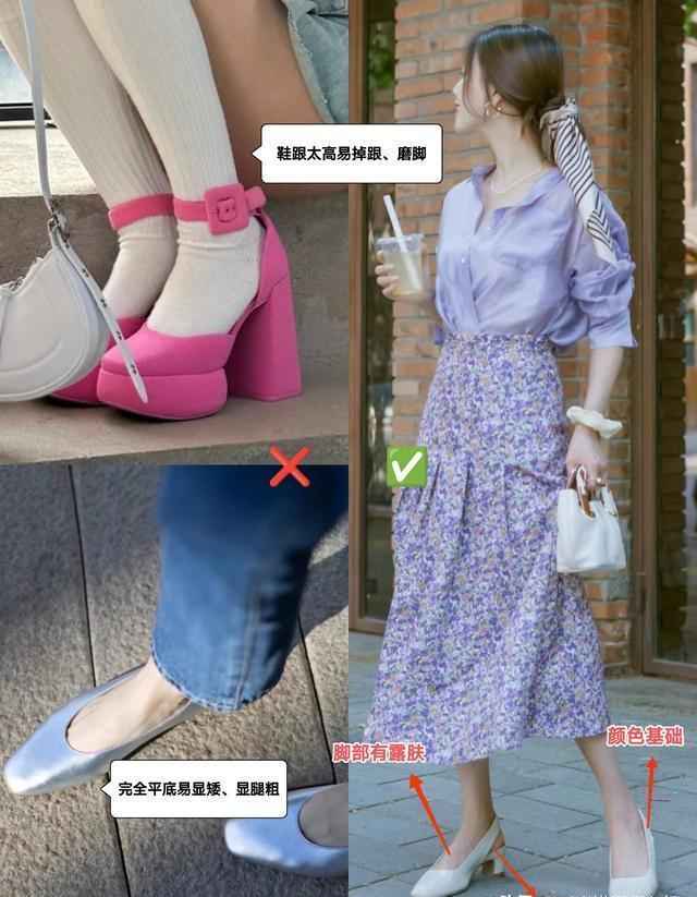 同样的碎花裙配衬衫,搭小白鞋略显学生气,换平头鞋立马精致升级。鞋子决定风格,选对气质翻倍。