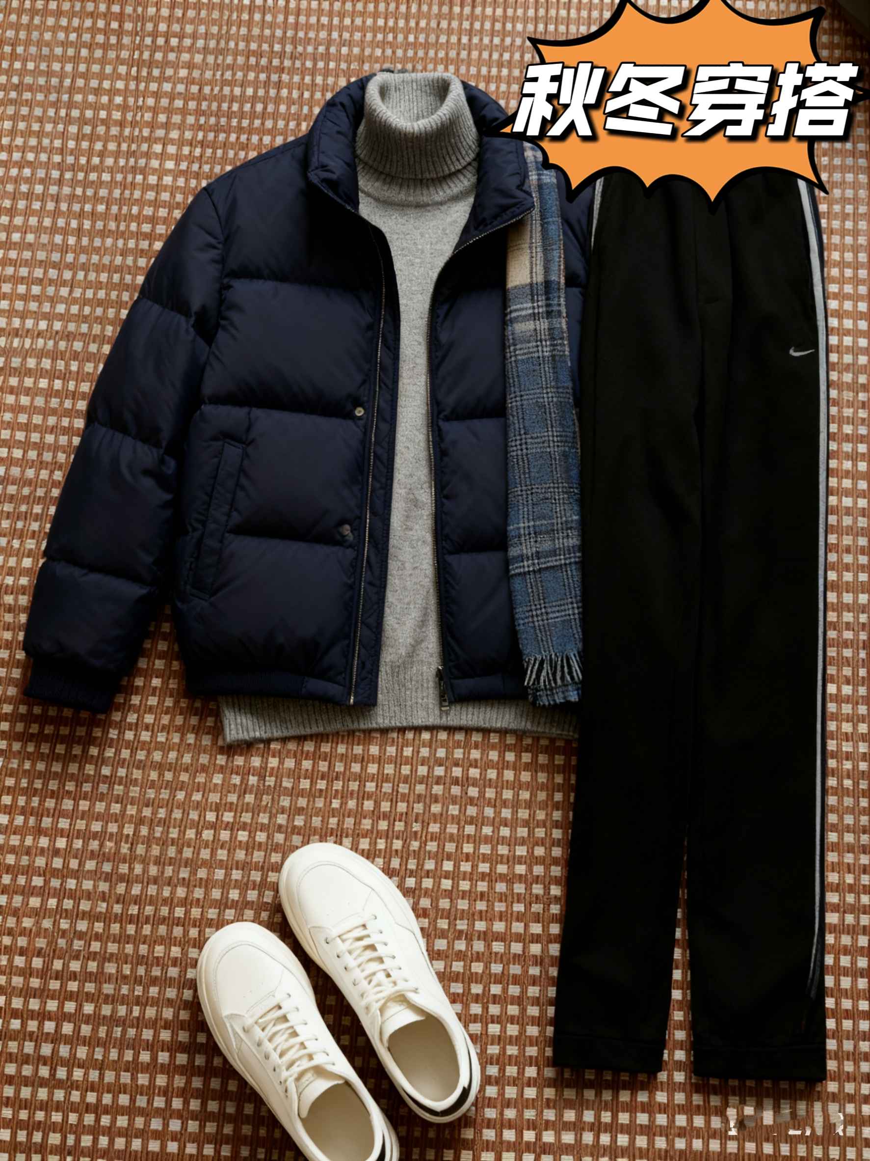 配色:藏青色(短款羽绒服)+浅灰色(高领毛衣)+黑色(侧边白条纹卫裤)+蓝灰格纹(围巾)+白色(板鞋)