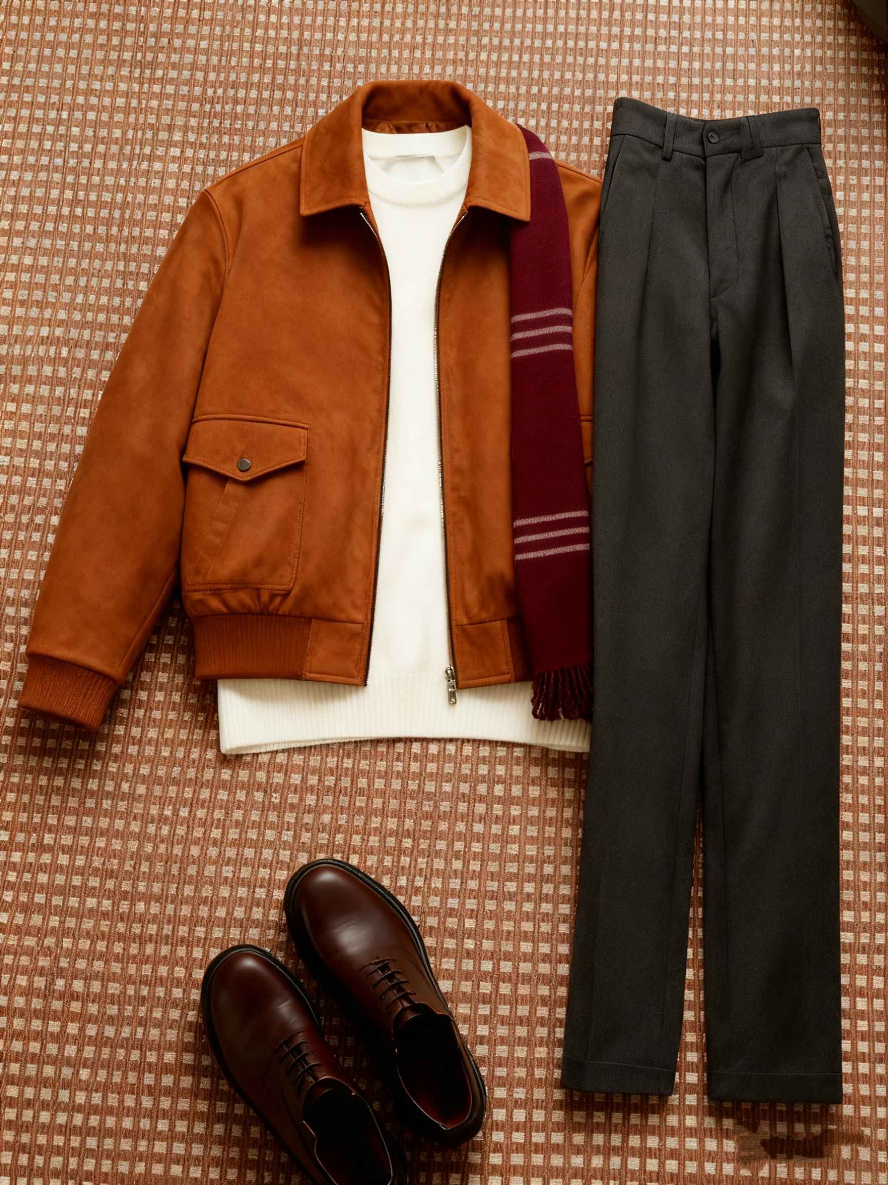 配色:焦糖棕(麂皮夹克)+米白色(高领毛衣)+深灰色(西裤)+酒红细条纹(围巾)+深棕色(皮鞋)