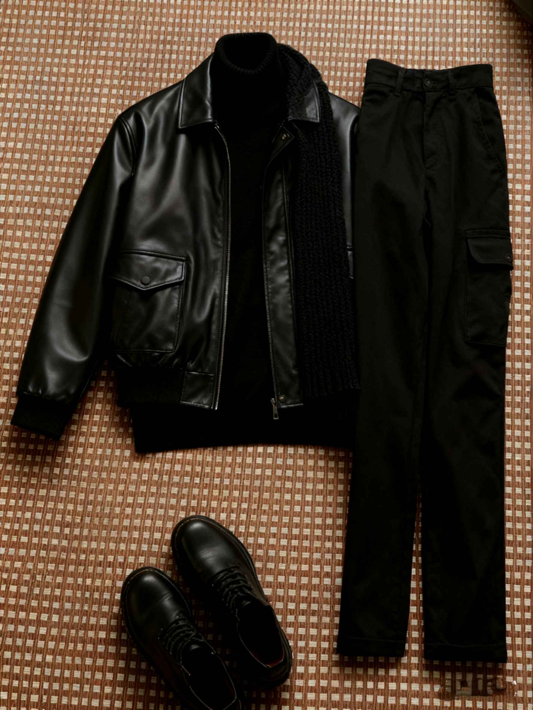 配色:亮黑色(皮质夹克)+哑光黑(高领毛衣)+黑色(工装裤)+黑粗针织(围巾)+亮黑色(皮鞋)
