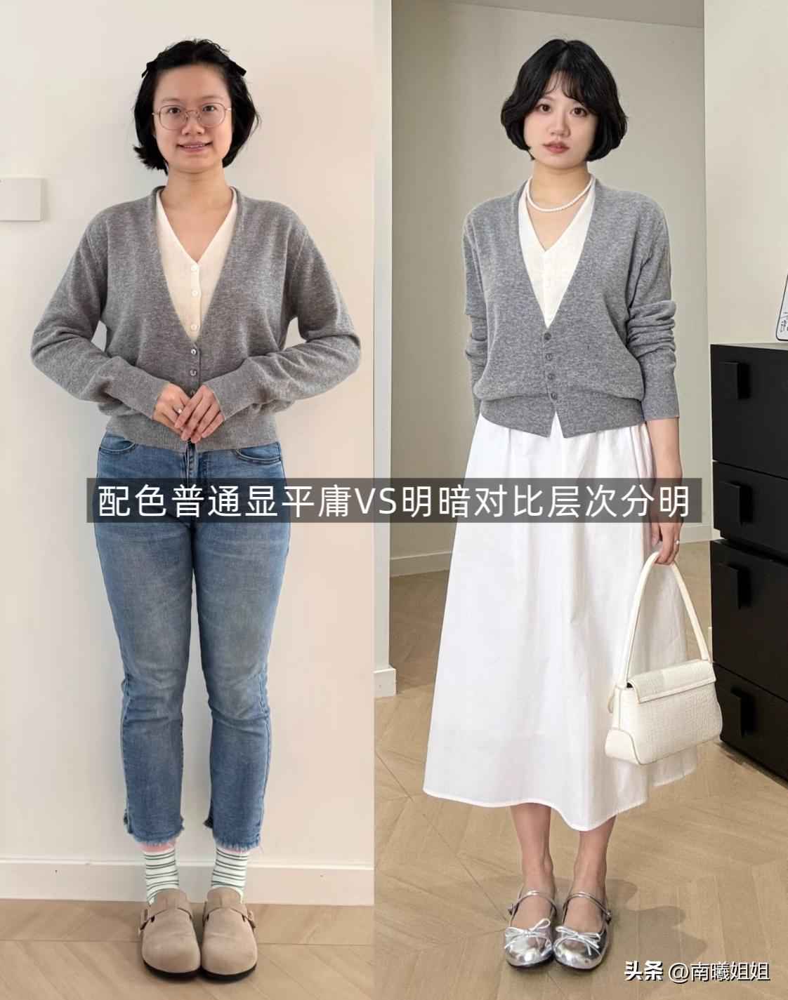 看这组对比图就懂了,同样是灰色毛衣,配蓝色牛仔裤显得很普通,但换成小白裙,颜色内外呼应,立马高级又显气质。
