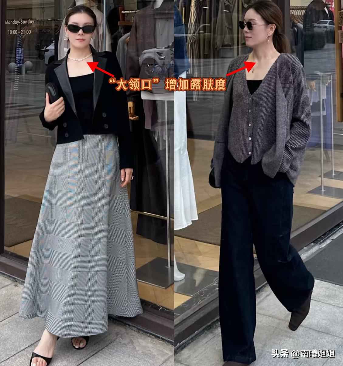 尤其是上衣选大领口,比如V领或方领,即使穿深色也能突出个人魅力。
