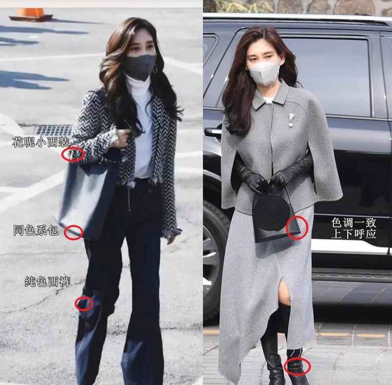 她选的版型不会太宽大,多是连贯的H型或X型线条,多为正肩设计,这样背部看着薄,脖子显长,身条修长。她一般不会配打底裤,而是搭裙子或长裤,保持整体简洁高级。