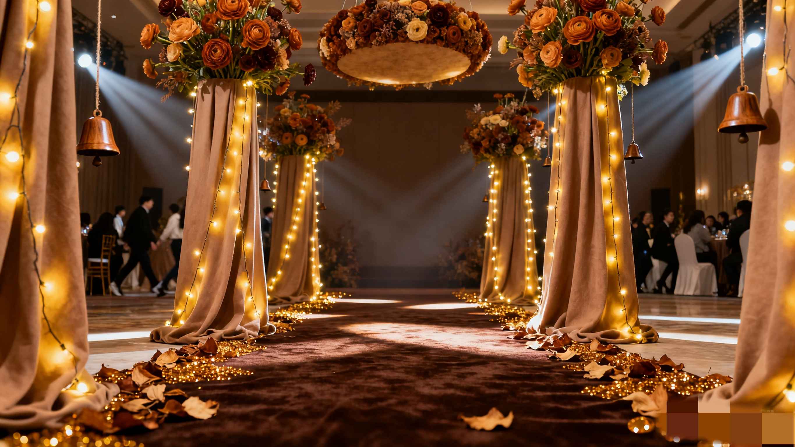 - 实用方案:通道两边用浅咖色布艺路引做底,绕上暖黄色串灯,顶上放圆形花艺——以焦糖色洋桔梗为主,配浅咖小雏菊和干枝,下面挂小木铃铛,人走过时叮当作响;地面铺深棕色丝绒地毯,撒点金棕色亮片和干花瓣,搭配侧面的暖光射灯,光影交错,拍照自带复古滤镜。