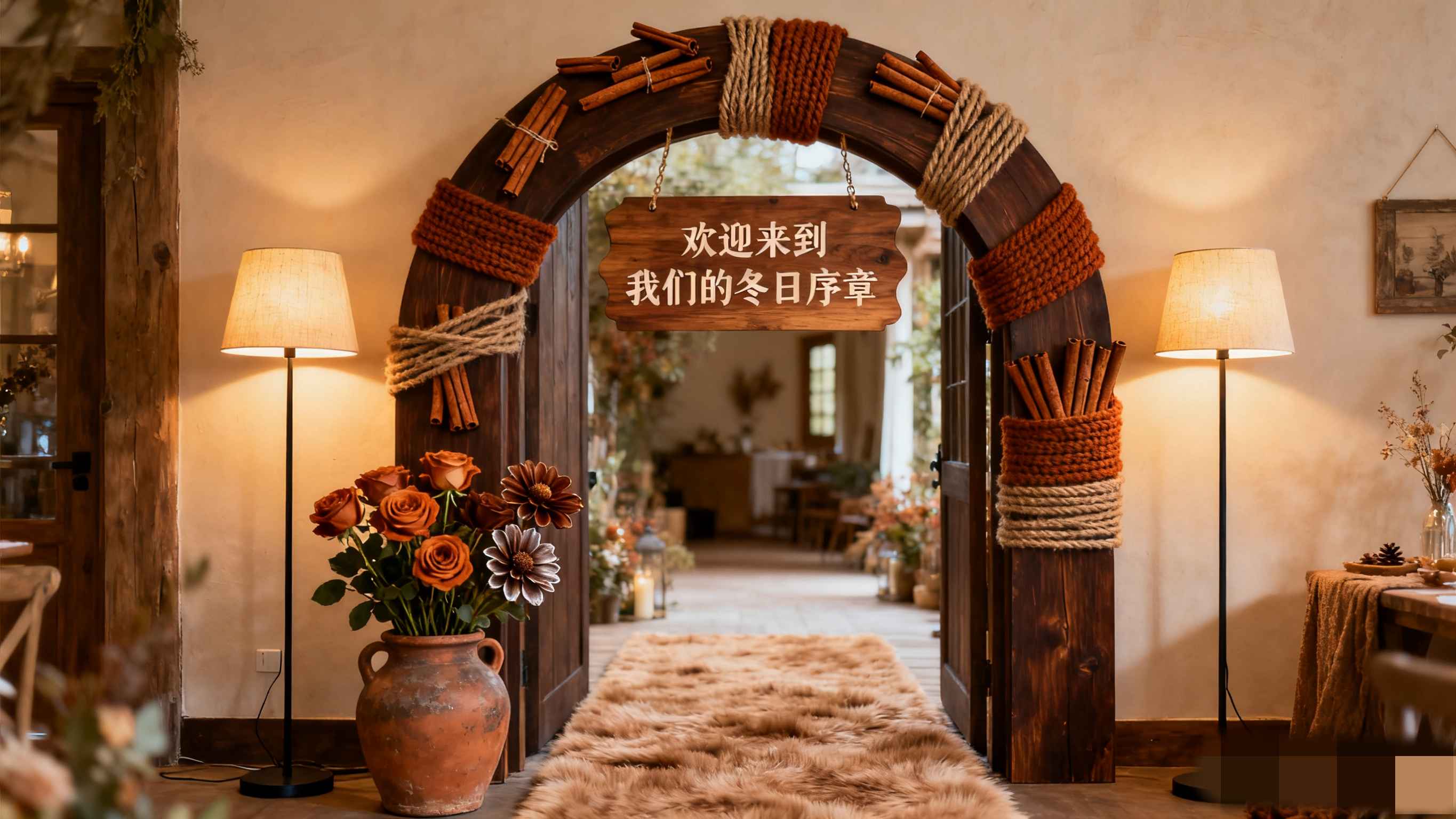 - 实用方案:用深棕色木制拱门做框架,缠上焦糖色编织绳和肉桂枝,门口放几个复古陶罐,插上焦糖色玫瑰、棕色银莲花和干树枝,再加点风干柿子和板栗,突出自然过渡的秋冬感;地上铺浅咖色毛毯,两边摆上暖光落地灯,灯光柔和晕开,配个“欢迎来到我们的冬日故事”木牌,仪式感瞬间爆棚。