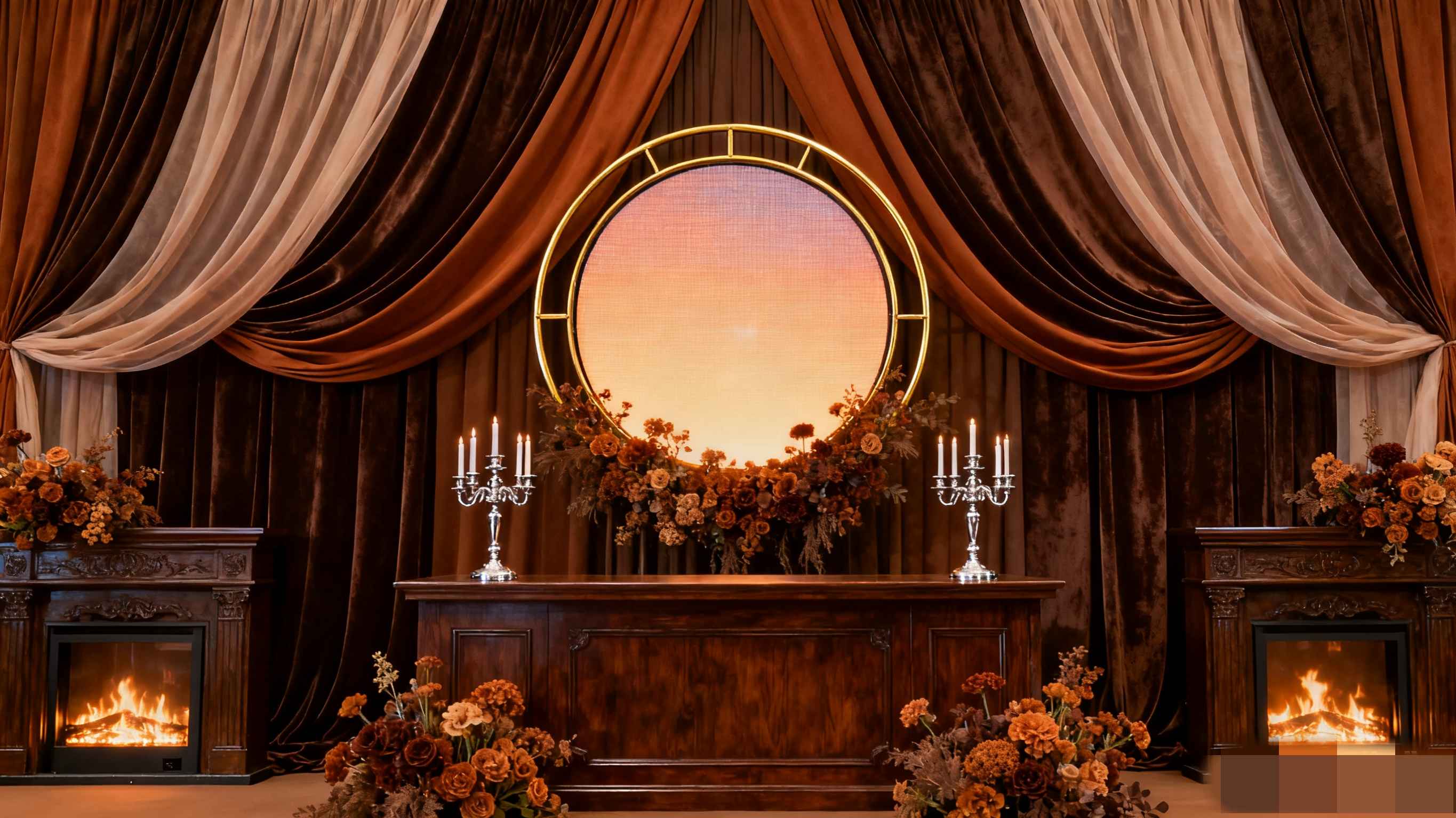 - 实用方案:背景墙用“三层布帘”设计——底层深棕色丝绒(垂感好,显高级),中层焦糖哑光布(增加纹理),顶层浅咖薄纱(营造朦胧感);中间用金棕色金属框圈出圆形,内置暖光LED屏,循环播放新人复古照;舞台中央放深棕色木制仪式台,摆上复古银烛台和焦糖色花艺,两边对称放壁炉造型装饰(用仿真火焰灯,安全又有氛围);舞台两侧挂复古吊灯,灯光柔和,避免强光,让新人看起来更温柔。