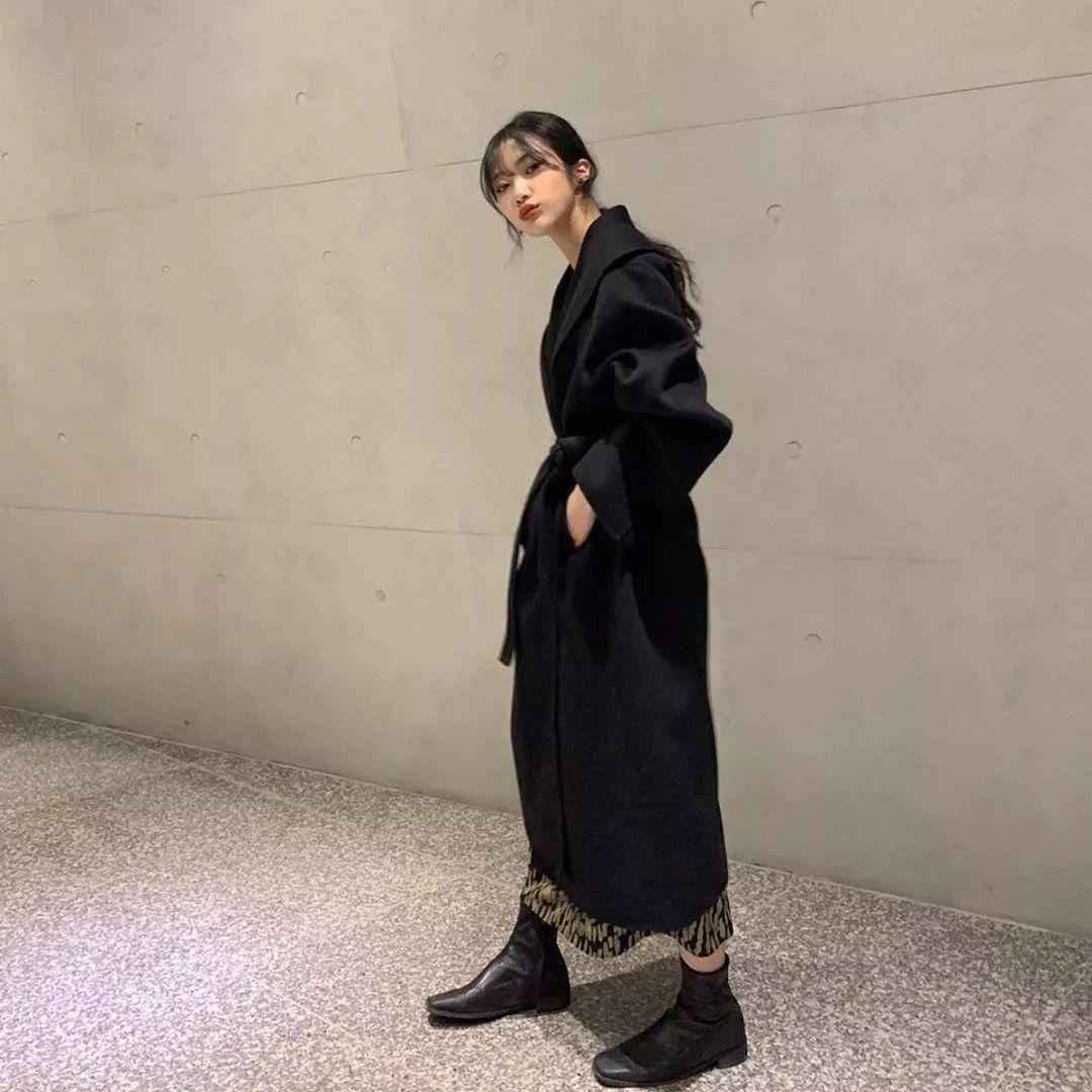 女生穿法更多样,长款大衣内搭裙装,露点裙边增加层次感,配高筒靴利落时髦。