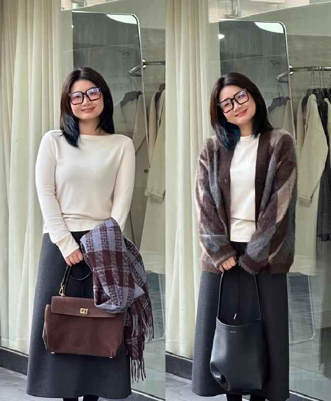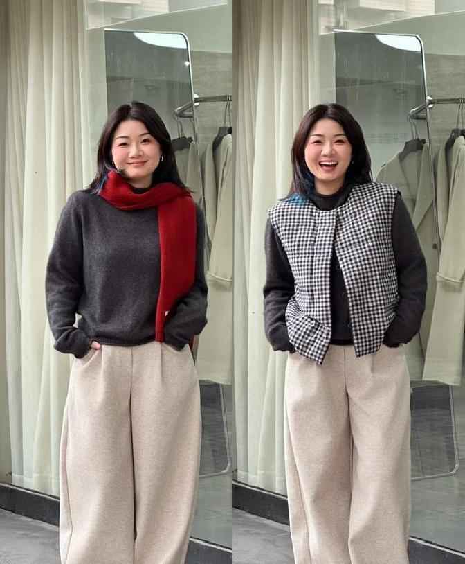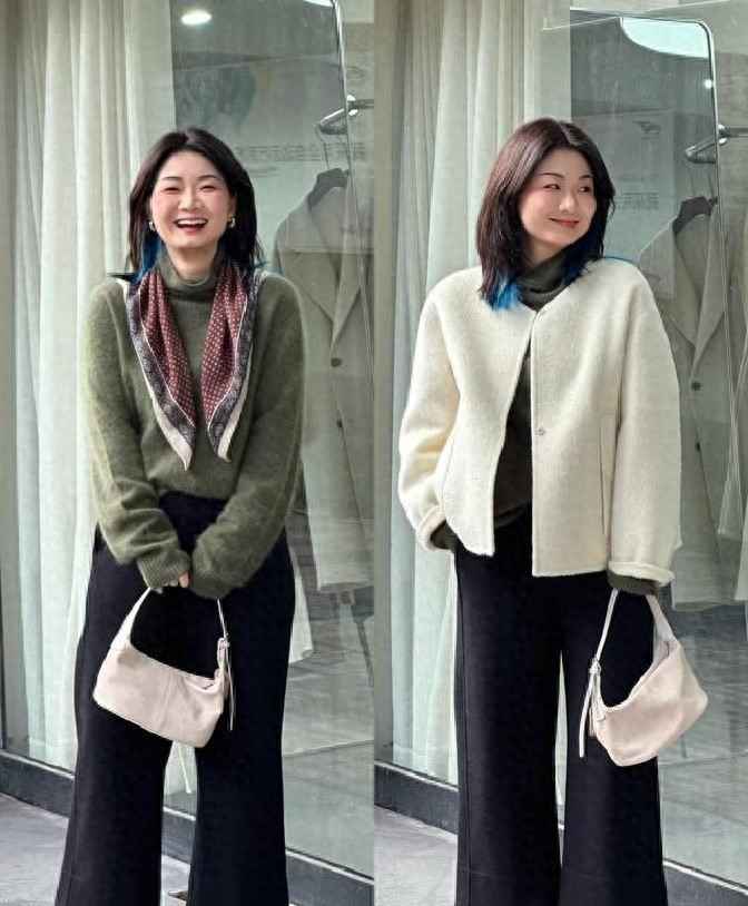 先说说黑色显瘦这个老话题,我得给大家提个醒。黑色确实能收窄视觉,但你们有没有试过穿一身黑反而显得更臃肿?我去年就踩过这个坑——裹着黑色大衣出门,朋友一见我就问:“你是不是又胖了?”气得我直跳脚。后来我才搞明白,关键不在颜色,而在层次。就像那位博主示范的,米白针织衫配灰色半身裙,深浅搭配一下子就把身材比例拉高了。
