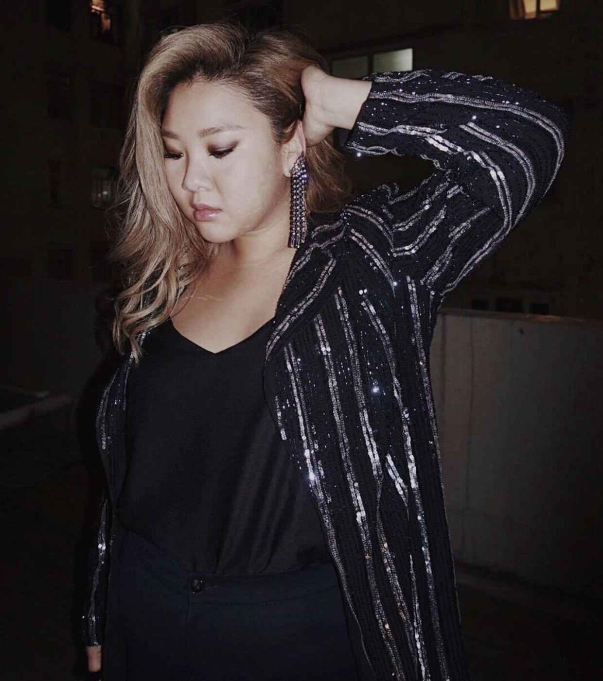 郑欣宜用亮片西装搭配黑色内搭,180斤照样性感迷人