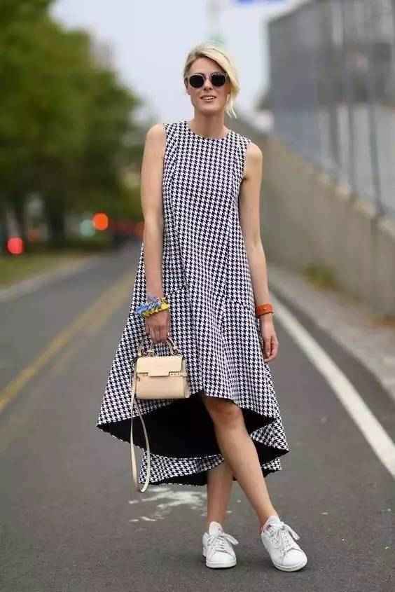如果你所在的职场环境更偏传统,觉得勃肯鞋还是有点随意,那也别急着搬出你的“刑具”高跟鞋。试试用简约的包裙搭配一双纯色运动鞋,比如经典的小白鞋。关键是,裙子要选剪裁利落、面料有垂感的,这样才能中和掉运动鞋的休闲,达成一种精干的平衡感-3。我有个同事就常这么穿,藏蓝色的直筒包裙配白衬衫和白色帆布鞋,看着又清爽又专业,下班去逛个街也毫无压力-8。