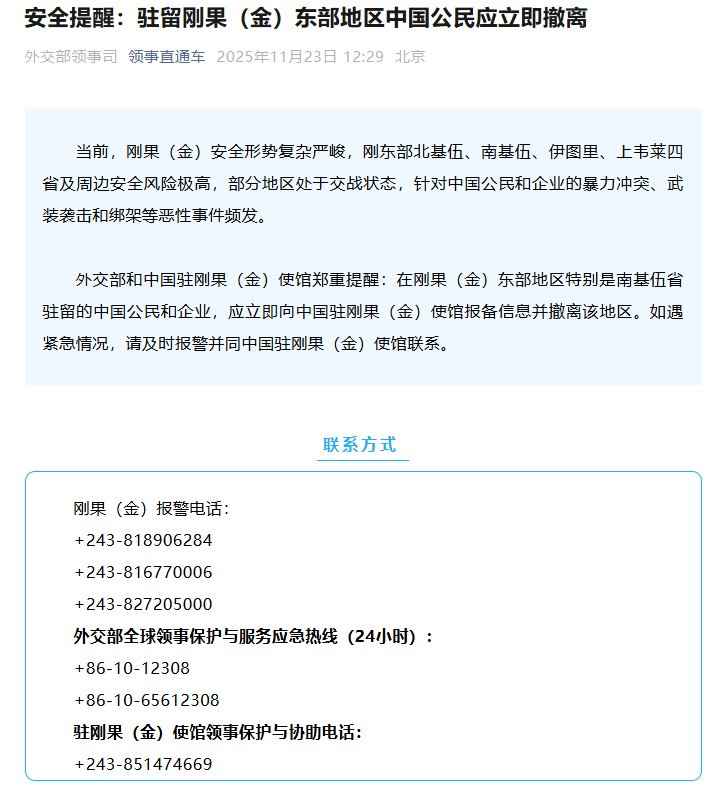 11月23日,中国外交部和驻刚果(金)使馆发布了紧急安全提醒,要求所有在刚果(金)东部地区停留的中国公民立即撤离,确保安全。
