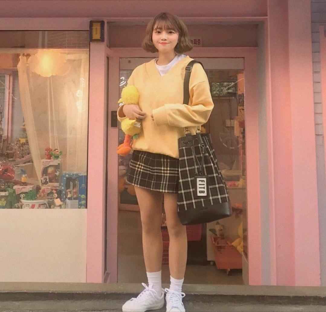 短裙是甜妹必备,微胖女孩选深色系更显瘦,比如黑色或黑格子款。上身搭浅色衣服提亮整体,但避开纯白色以免膨胀。