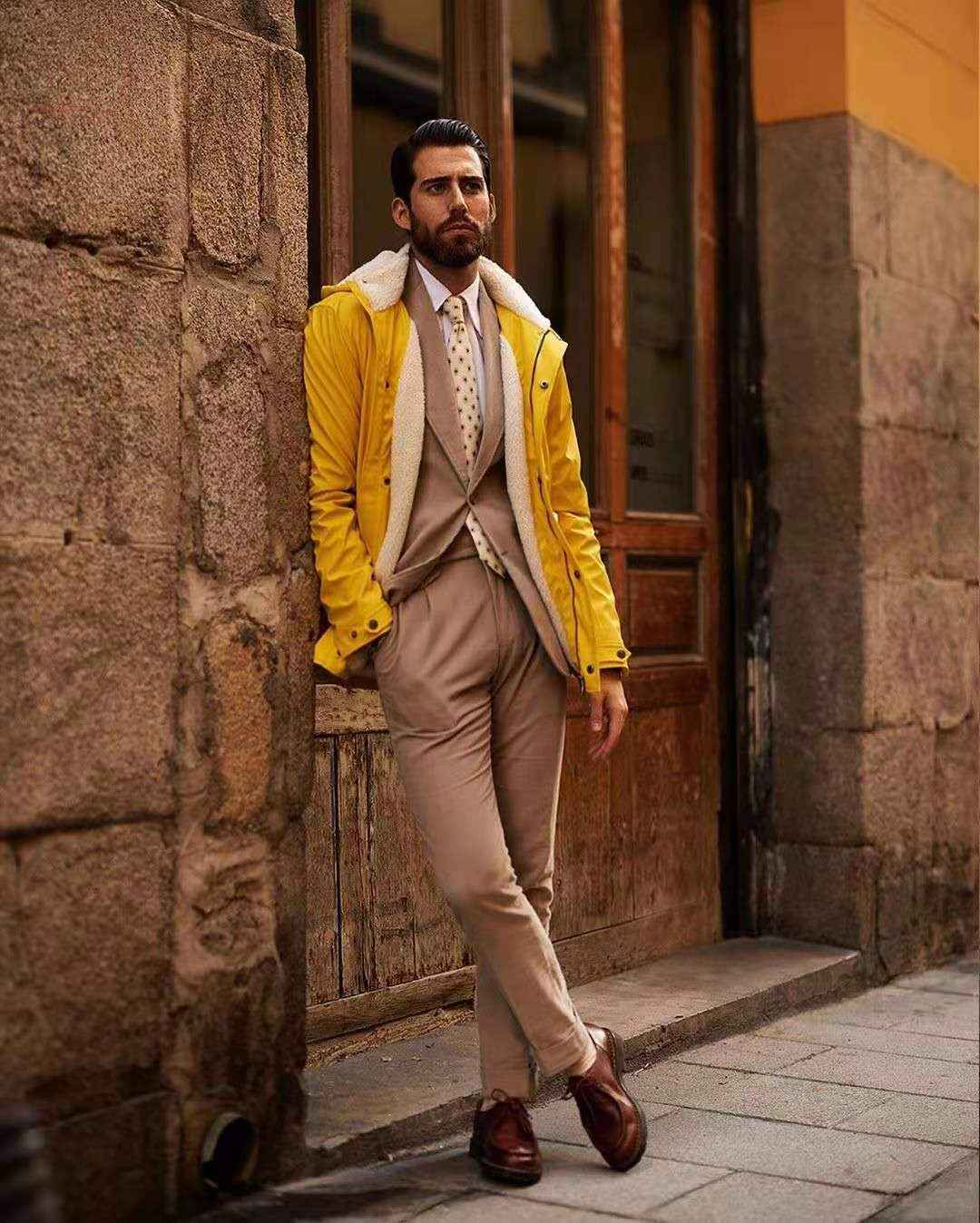 轻快的黄色穿在成熟男人身上?内搭加入白色即可平衡。鲜艳色男人也能驾驭。