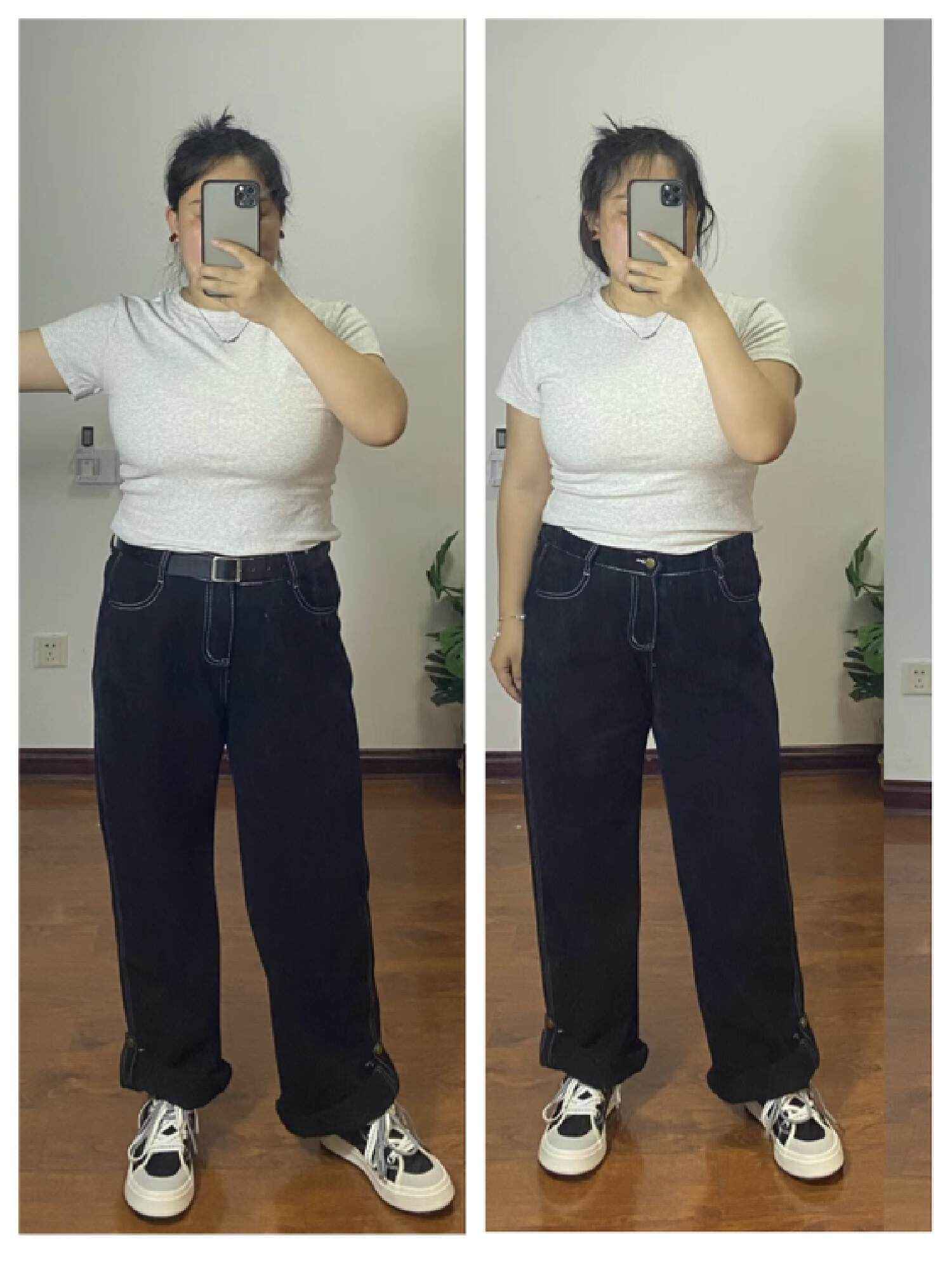 直筒裤一定要选高腰款,矮个子女生强调腰线很重要。可以用皮带来突出腰线,拉长腿部比例。如果裤子太长,就挽起来避免拖沓。