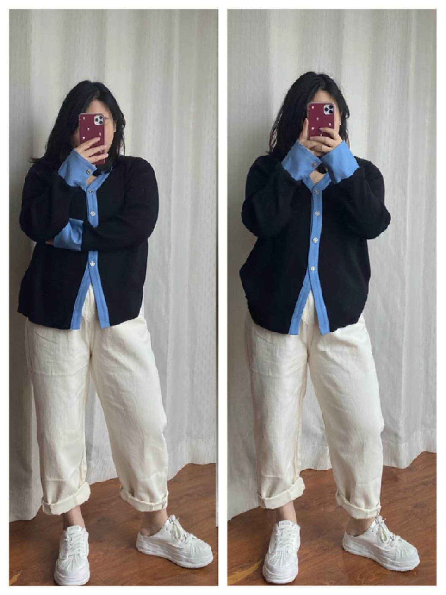 注意线条细节能视觉拉长身材。对比下图,左边全扣针织衫显臃肿老气,右边敞开形成V领,更青春有型,露出的白内搭还和鞋子色彩呼应。