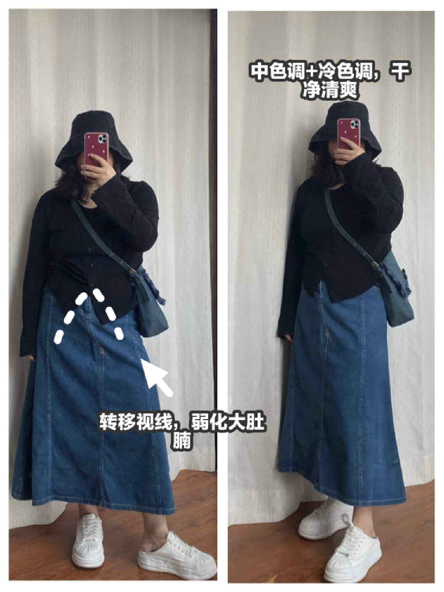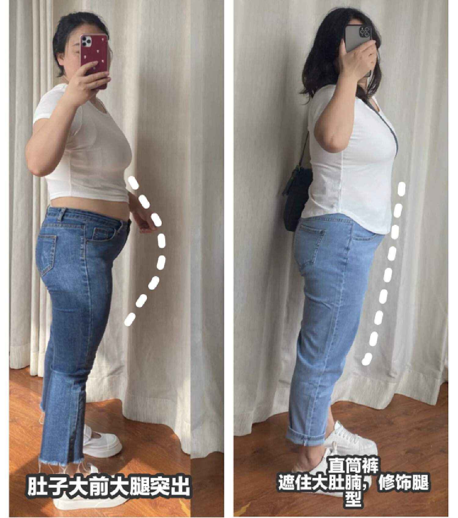 中年女性最好避开紧身牛仔裤,尤其是矮胖体型。看下图对比就知道,紧身裤会暴露腿型问题,穿起来也不舒服,对健康也不友好。