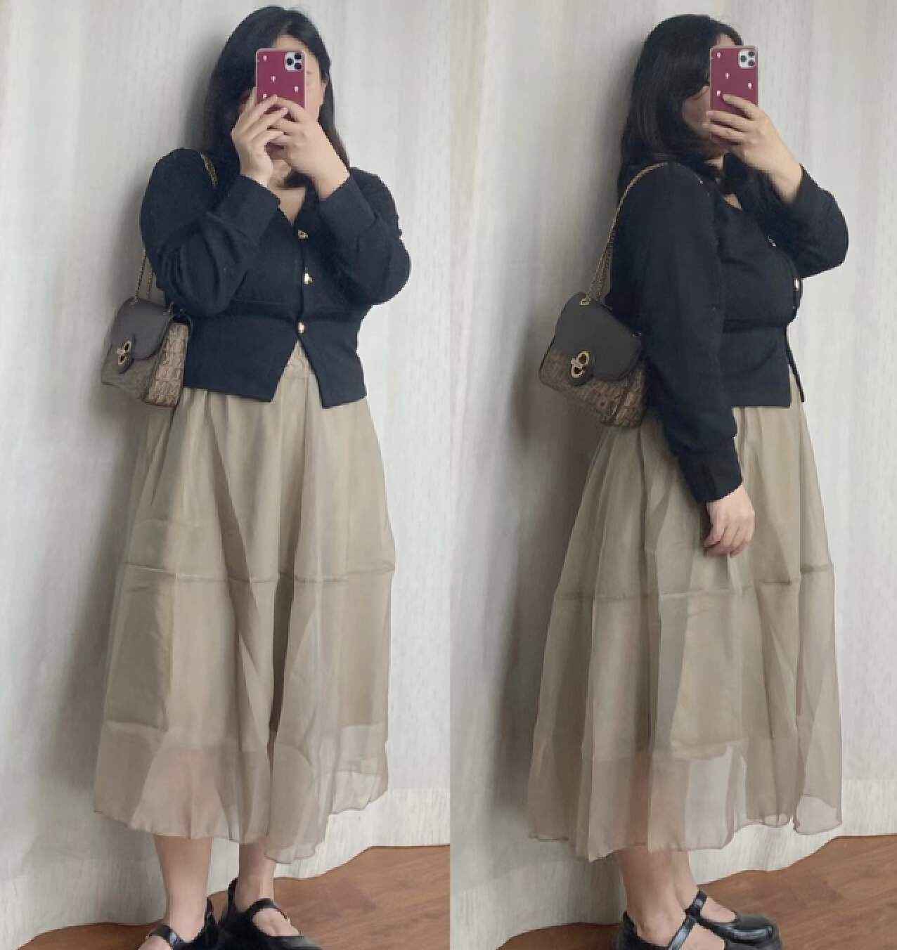 针织衫配廓形长裙,比如灰色针织衫搭咖色长裙,既时尚又好看。下图博主有两个技巧:一是针织衫的V领设计,二是扣子系在腰最细处,这样收腰又显瘦。