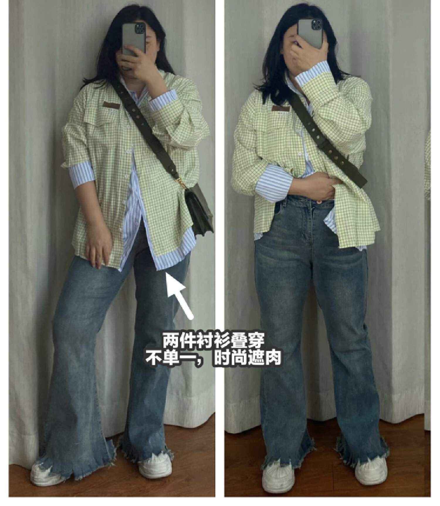 中年微胖女性叠穿要简单,颜色搭配好。叠穿能转移视觉重心,比如下图博主叠穿衬衫,遮住了上半身缺点,袖口和腹部细节更时尚显瘦。