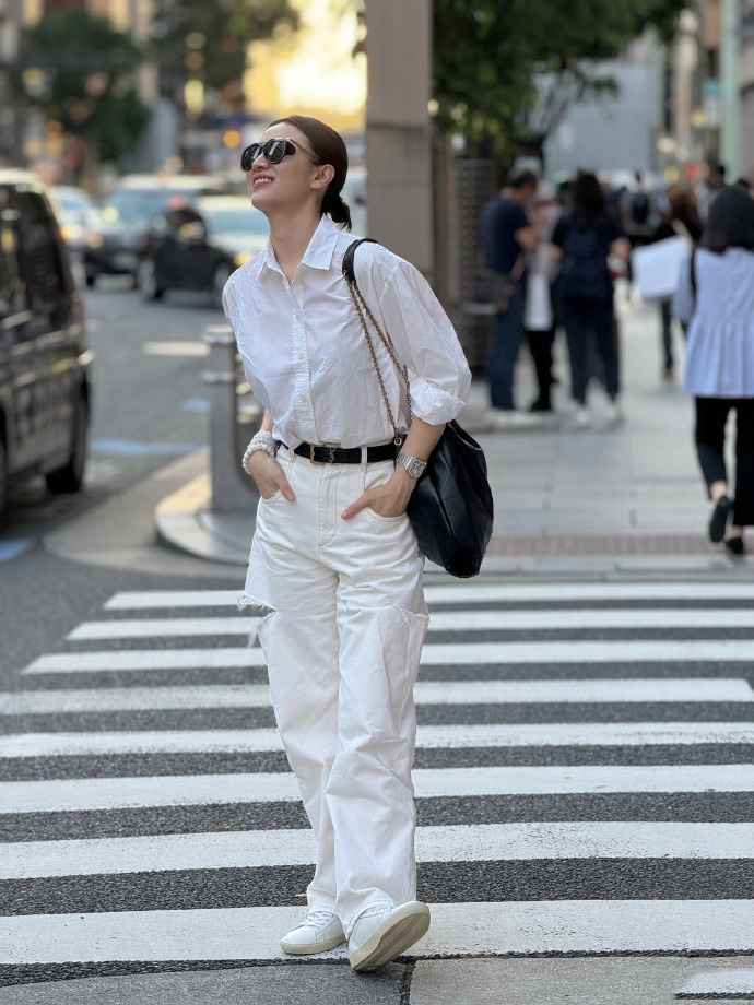 白衬衫是宋佳的最爱,她常穿普通白衬衫搭白色牛仔裤,破洞设计增添个性,再配双小白鞋,整体简约大方,特别显气质。