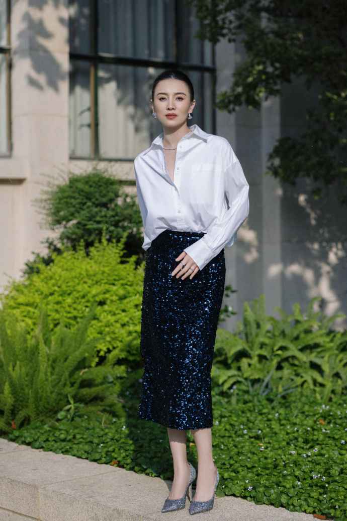 白衬衫配亮片裙这种组合平时少见,但宋佳穿起来既时髦又优雅,还带点酷感,特别适合想突破常规的女生。