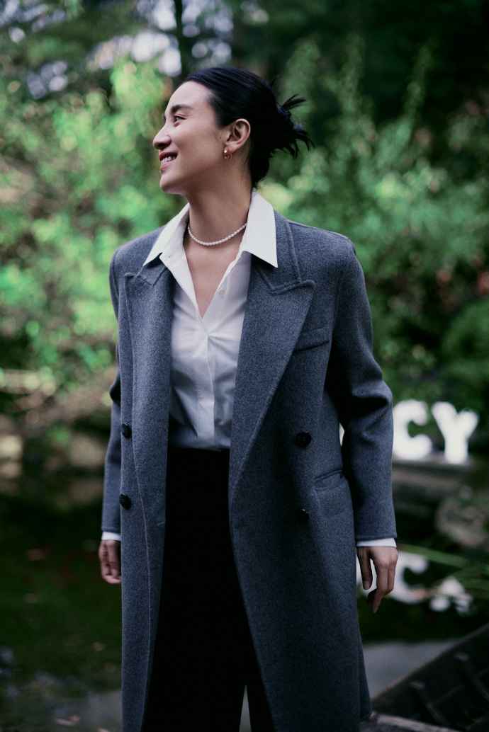 入秋后大衣登场,白衬衫配灰色大衣,故意松开一两颗扣子露出锁骨,加条珍珠项链,瞬间提升女人味,优雅又高级。