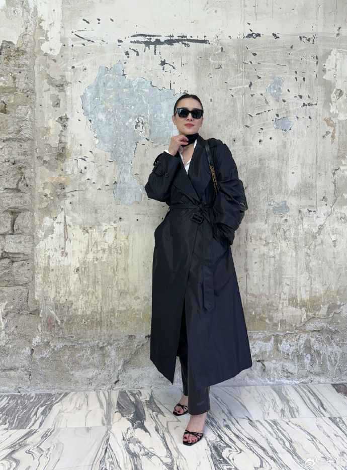 宋佳的高个子穿长风衣太合适了,这件黑色风衣像量身定制,内搭白衬衫,腰带束出细腰,墨镜一戴,帅到没朋友。