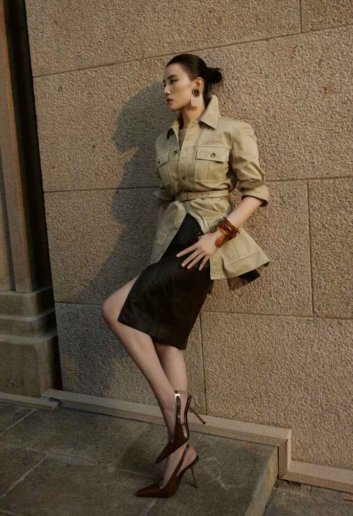 宋佳的风格飒爽中带柔美,军绿色牛仔外套加腰带优化比例,下装配黑色直筒裙和高跟鞋,气质满分。