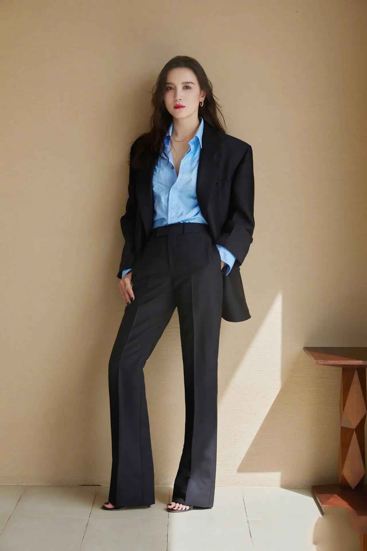 一身黑色西装干练大气,内搭蓝色衬衫打破沉闷,增添一抹亮色,显得明媚又有型。