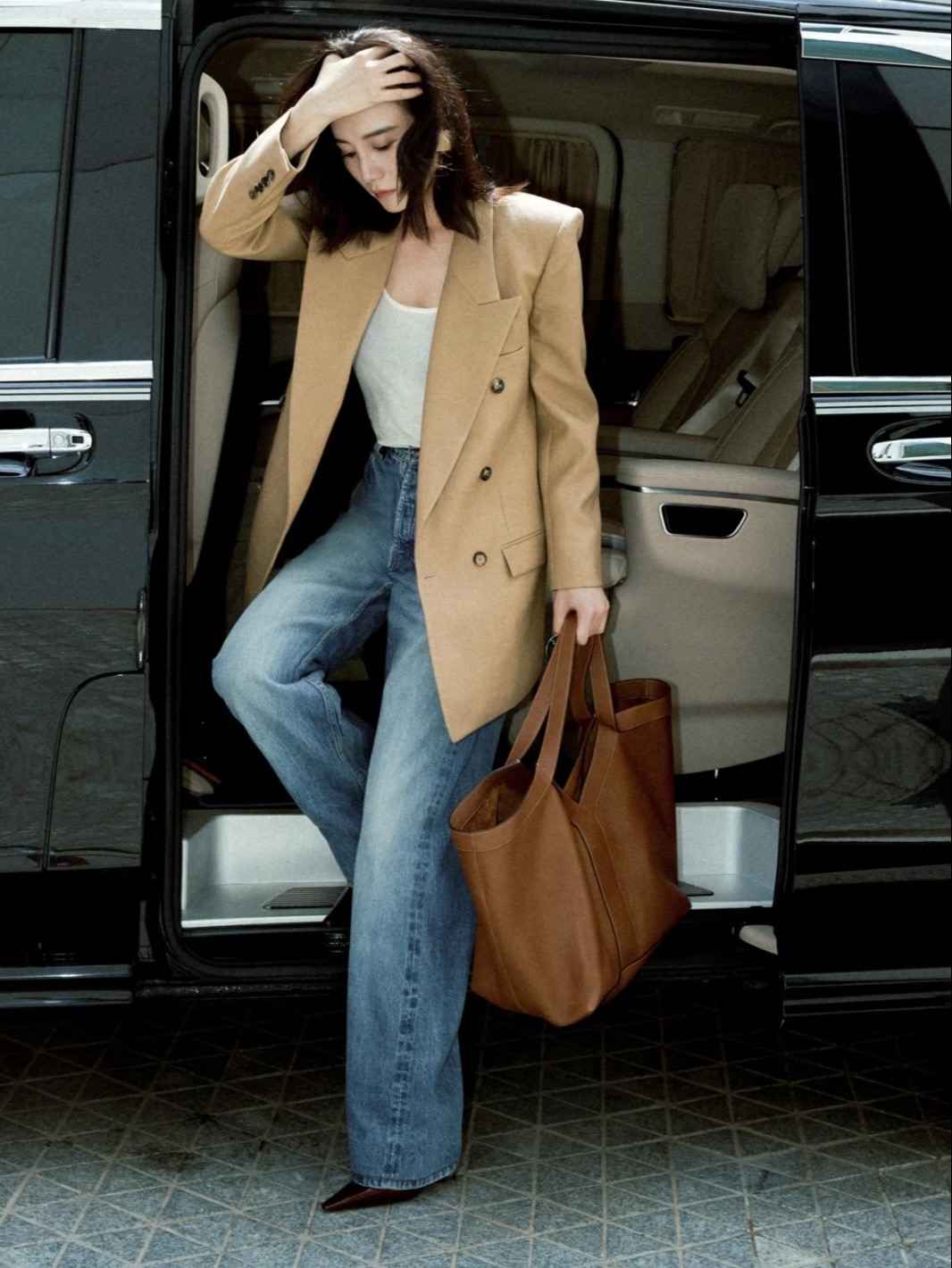 除了黑色西装,卡其色西装也很出彩,内搭白色吊带,下穿直筒牛仔裤,拎个深卡其大包,酷飒又时髦。