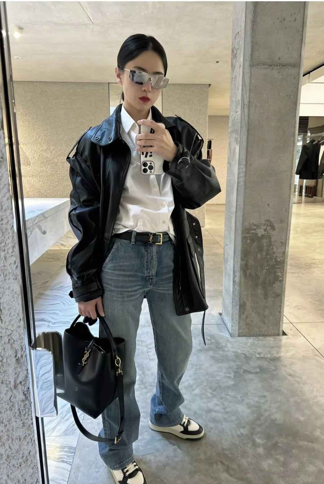除了衬衫,宋佳也爱牛仔裤,白衬衫+牛仔裤+黑色皮衣,三大基础款组合,完美诠释简约即高级。