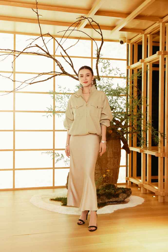 她的搭配常结合干练与女人味单品,卡其色短外套配缎面半裙,配色高级,日常穿很有参考价值。