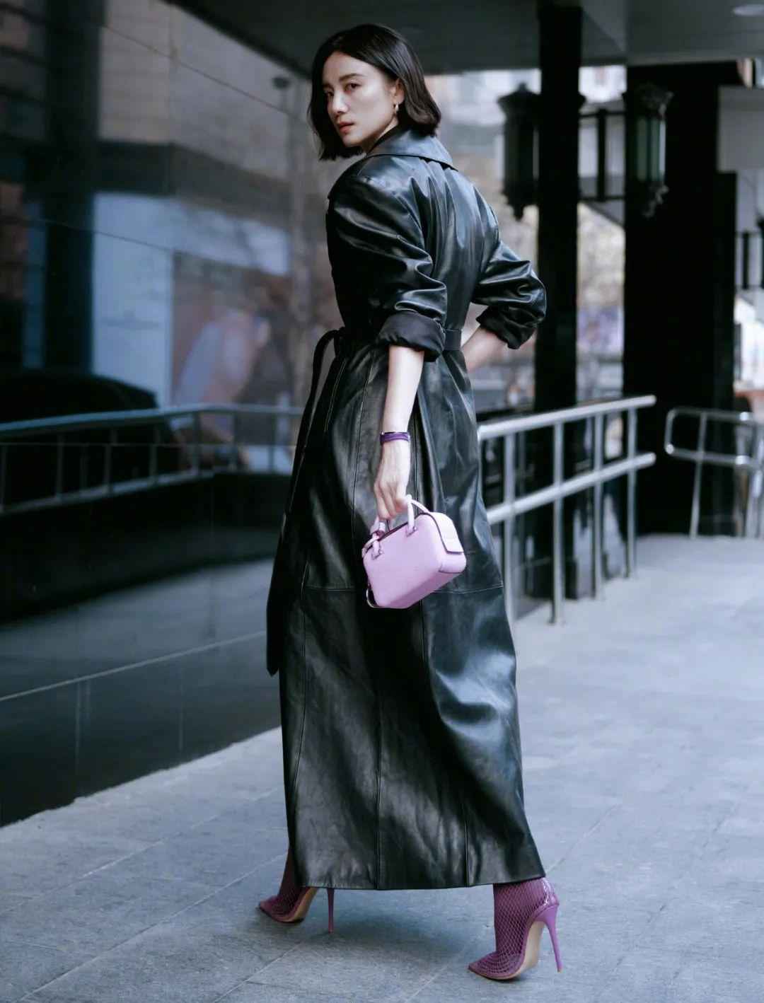 长款皮衣只有高个子能驾驭,宋佳穿起来配紫色高跟鞋和包包,帅气又不失优雅,气场全开。