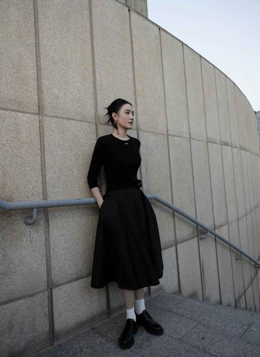 宋佳很少穿亮色,多选黑白灰基础色,适合40+女性。这身黑色连衣裙配白袜和小黑鞋,高级又显气质。