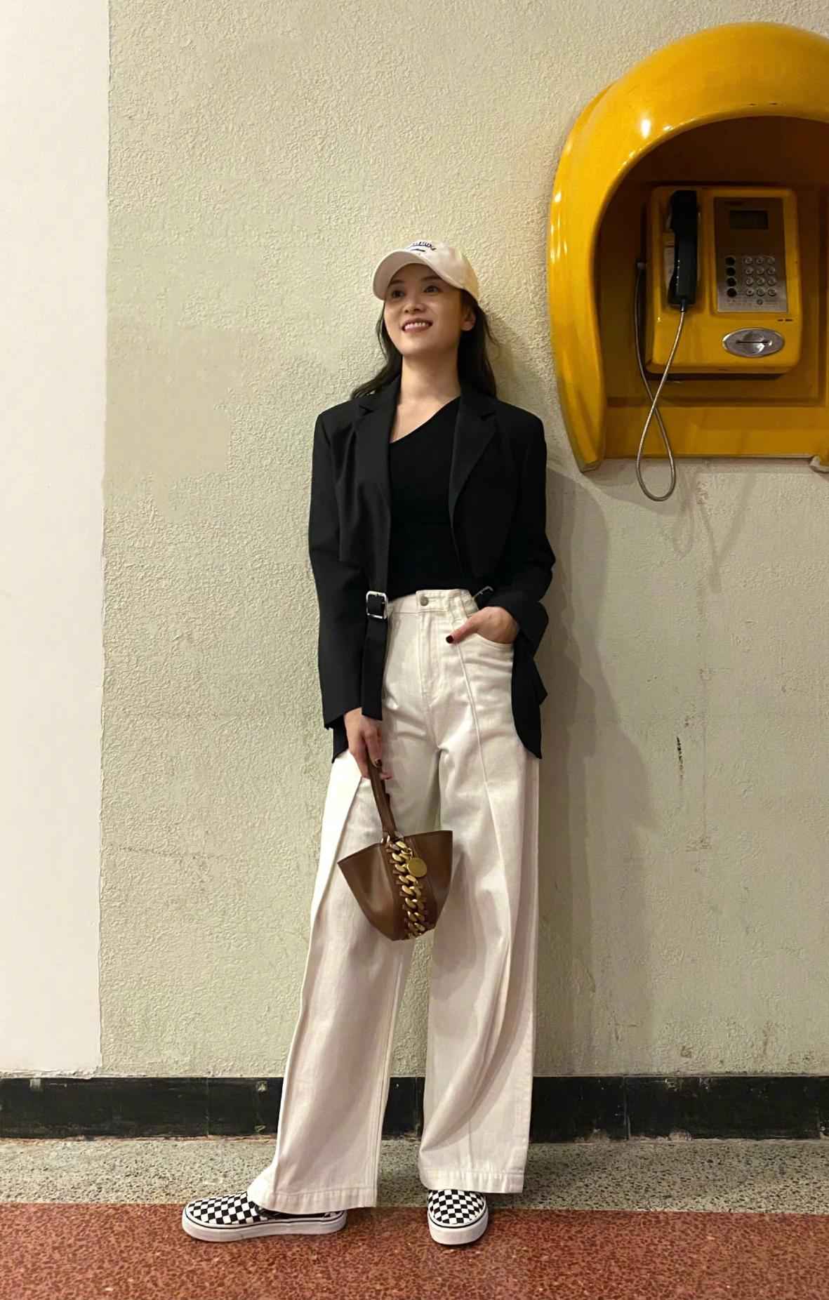 斜边内搭配白色阔腿裤,外披黑色西装,利落剪裁让基础款不单调,更显洋气。
