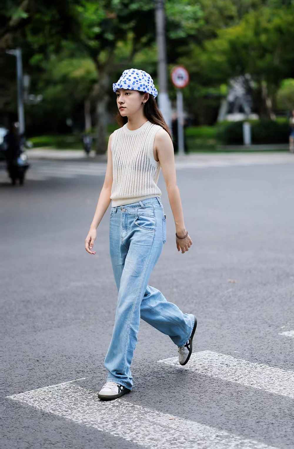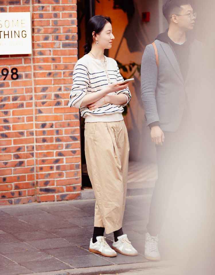 取而代之的是薄底鞋,其中德训鞋最受欢迎,轻便的设计穿起来舒服又有型,搭配阔腿裤时裤腿和鞋子衔接自然,轻松营造出随性高级的look,难怪上海、杭州女生都爱穿。