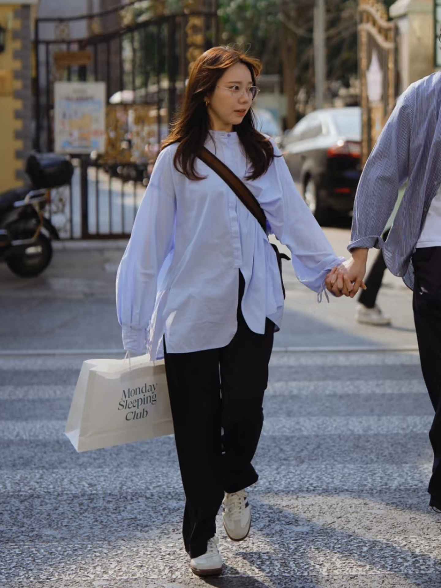 比如,白衬衫配牛仔阔腿裤和德训鞋,脖子上戴条项链,手提编织包,松弛中带点精致,轻松穿出高级感!春日生活打卡季