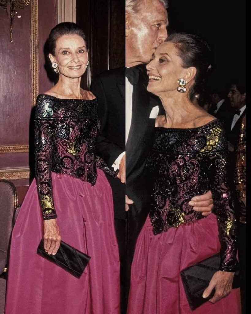 8. 年纪大了的赫本依然优雅,这件露肩上衣配粉裙,衬得她身材苗条,气质不减当年。