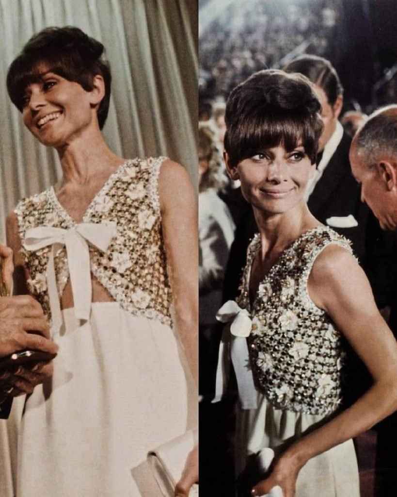 3. 1990年拿金球奖杰出贡献奖时,赫本选了条奶油色连衣裙,简约又不失大气,特别适合这种正式场合,显得她格外温婉。